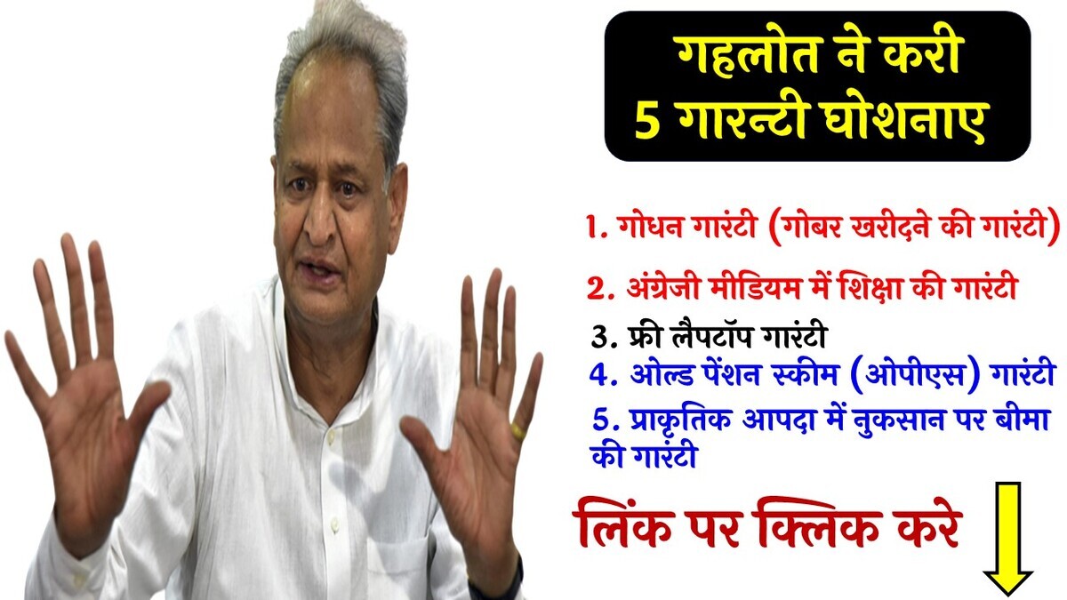राजस्थान के मुख्यमंत्री अशोक गहलोत ने शुक्रवार को जनता के लिए 5 महत्वपूर्ण घोषणाएँ की हैं। चुनाव घोषणा पत्र आने से पहले ही कांग्रेस ने 7 वादे कर चुकी हैं, जिनमें से दो वादे प्रियंका गांधी की झुंझुनूं सभा में दिए गए थे। इन 5 घोषणाओं में मुख्यमंत्री ने महिला, किसान, कर्मचारी, विद्यार्थियों, युवाओं और आपदा पीड़ितों के लिए सीधे बेनीफिट वाले वादे किए हैं।